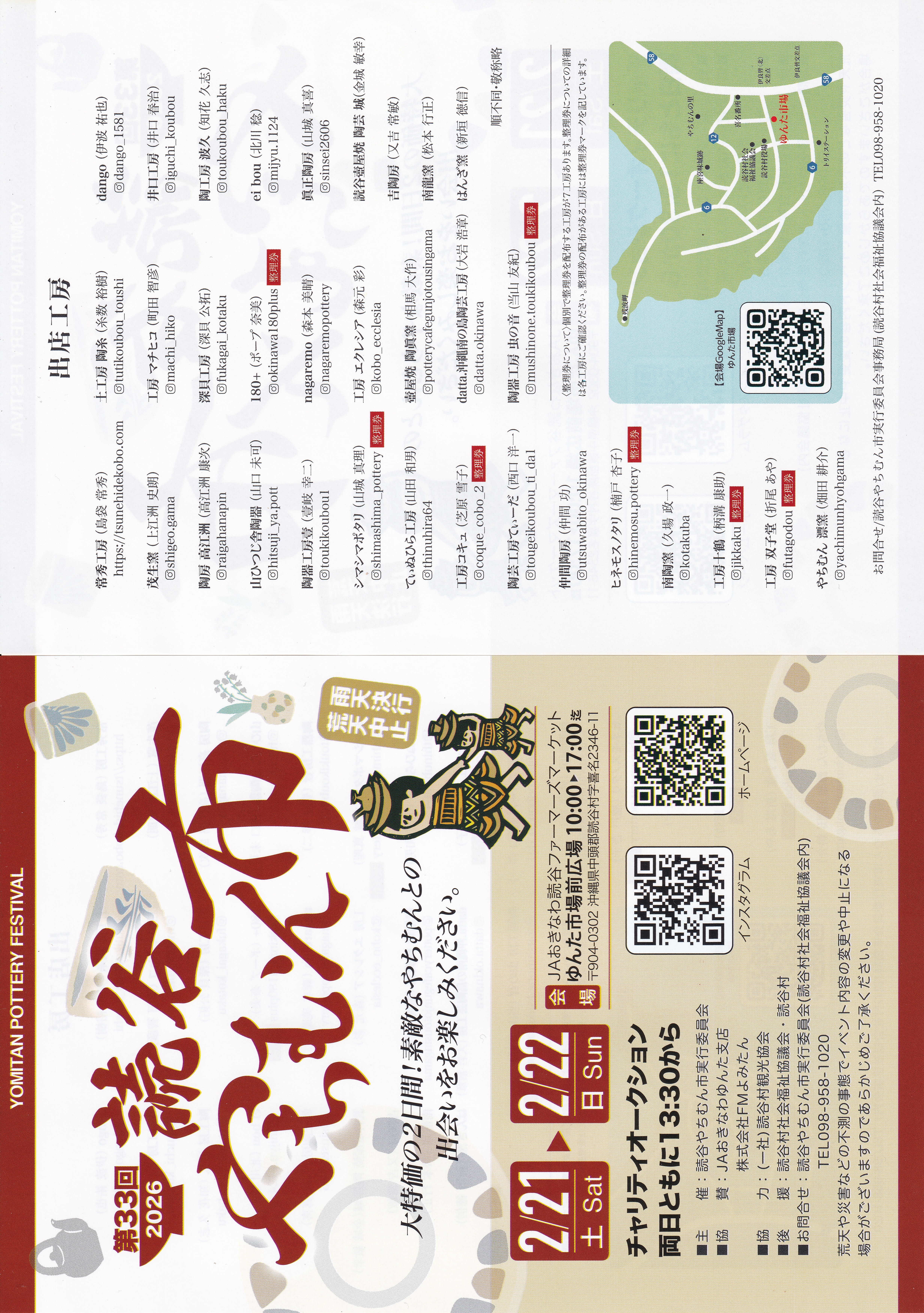 2026.01.24 読谷やちむん市2026 お知らせ 第33回読谷やちむん市に出店いたします。 2026年2月21日(土)~22日(日) 主にB品などの販売となります。 ※やちむん市のブースは現金のみとなります。 期間中も工房ギャラリーは通常オープンしております。 ※ギャラリーはB品販売はございません。 クレジット決済(タッチ)対応しております。 シェアする Back Index
